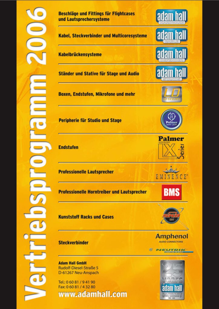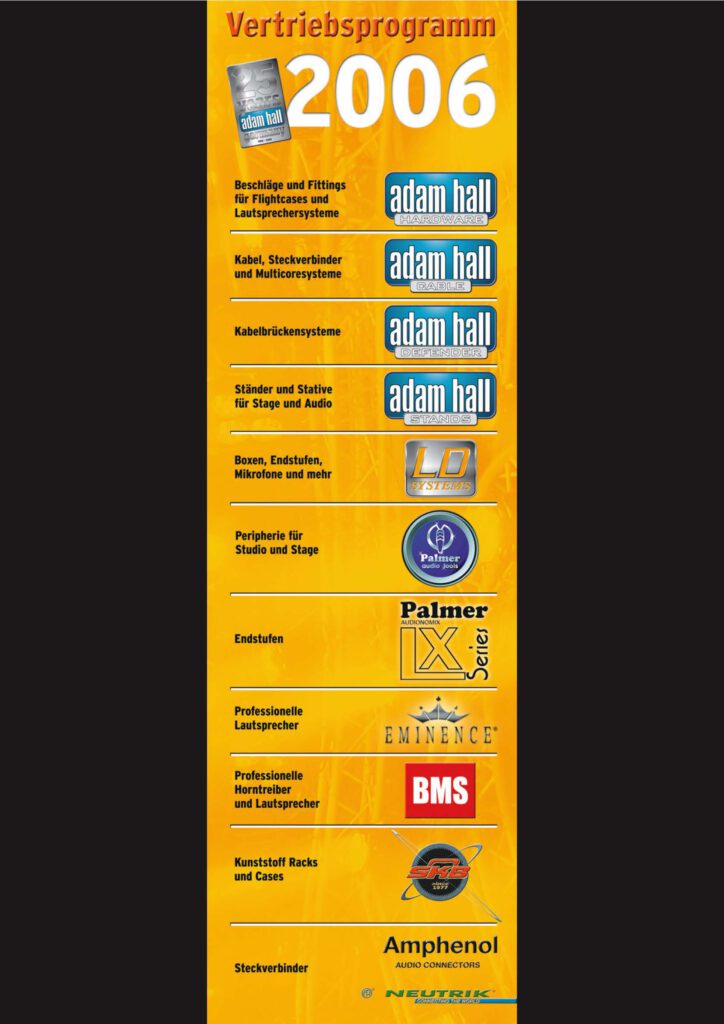 Für die großartige Adam Hall GmbH gestaltete ich 2006 die Grafiken, Broschüren, Prospekte, Anzeigen und Flyer für den Messestand auf der Light&Sound-Messe in Frankfurt am Main.