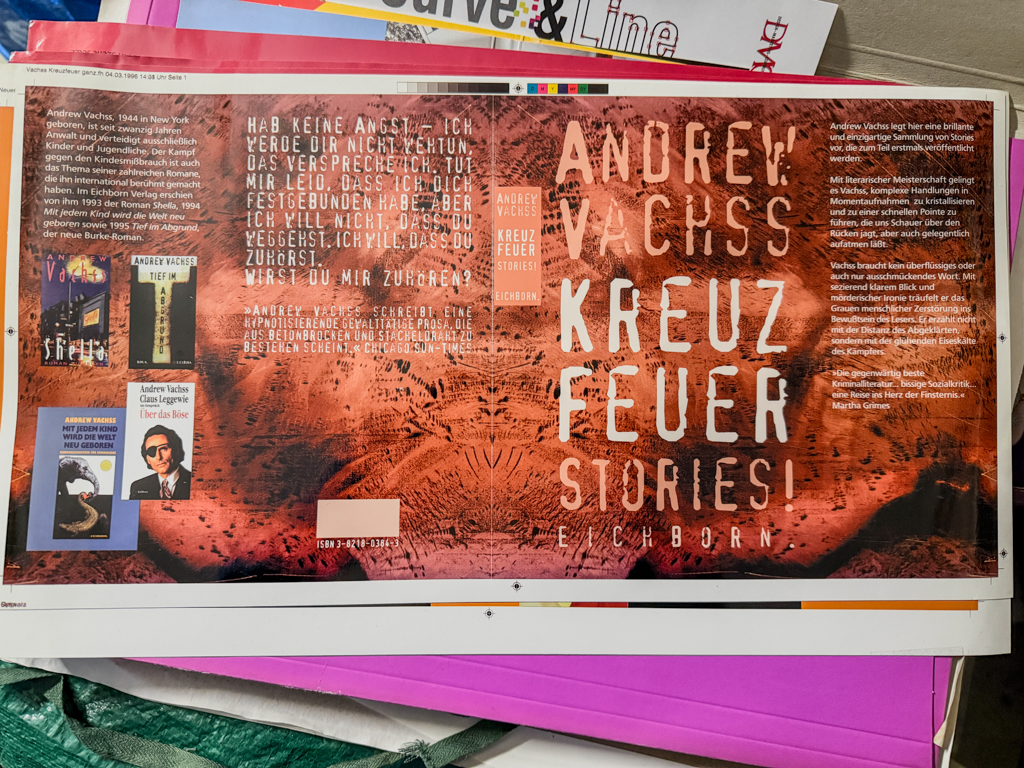 Die Gestaltung war endgültig auf dem Computer angekommen. Ich produzierte über 800 Buchcover, Schutzumschläge, Schuber. Jedes Cover hatte mindestens 5 Gestaltungsvorschläge hinter sich. Zahlreiche Verlagsvorschauen und Werbedrucksachen.